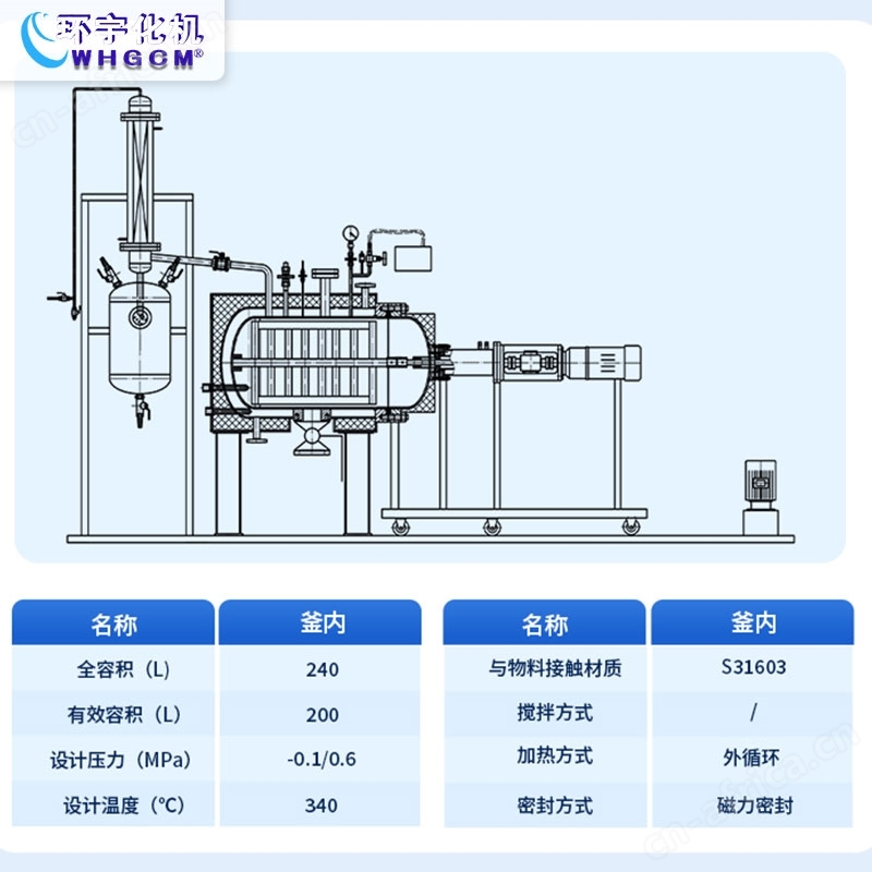 本设备是一款全容积240升,有效容积200升的卧式结构反应釜,专为化工、制药、食品及新材料领域的中试放大与工艺优化环节而设计。其核心价值在于精准衔接实验室研发与大规模工业化生产,通过模拟生产条件,为用户提供可靠的工艺数据与操作经验,是降低产业化风险的关键装备。