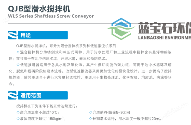为了保证潜水搅拌机的正常工作,请正确选择工作环境和运行模式。如有特殊要求可与本公司联系。