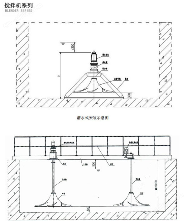 整机由驱动装置和双曲面叶轮体及安装附件组成,为了满足用户不同工况条件下的使用,安装分为干式(也称立轴式)和潜水式两种。干式安装,将驱动装置固定在工作桥上,通过传动轴将动能传至介质中的叶轮部件,它用于含固率高,水温高,含有磨蚀性的液体中,由于叶轮具有自动纠偏,运行较平稳,减速机噪音小于60分贝。潜水式安装,可免去桥架,采用潜水动力,利用设备自重定位,安装灵活方便,适用在水深较深,且水质稳定,不含磨蚀性的水体,水温不大于40℃,PH值6~9之间,其特点是无噪音,无视觉障碍。