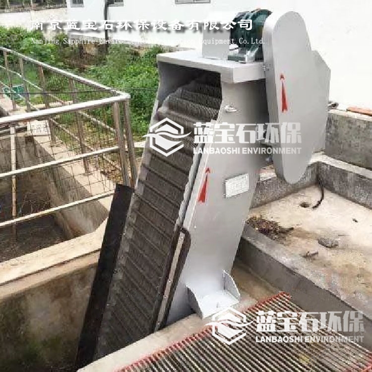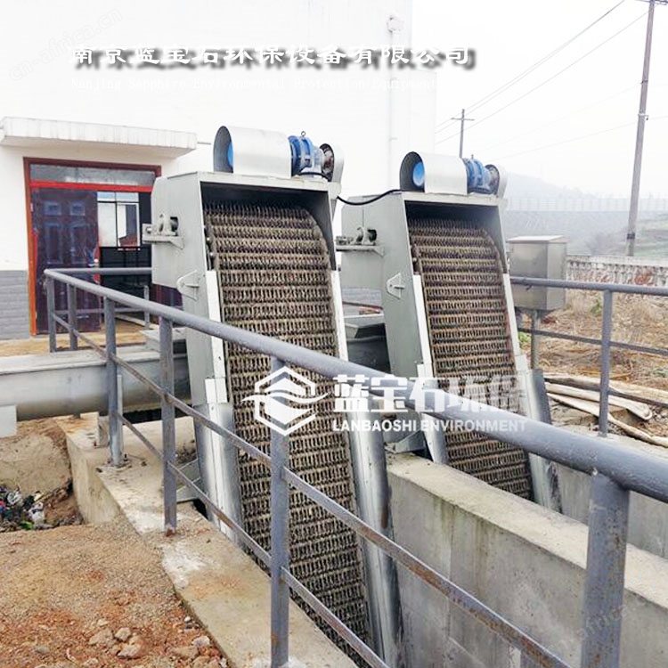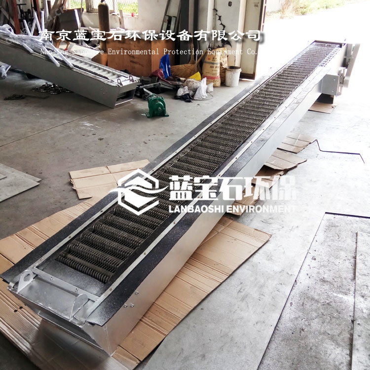 由尼龙或304不锈钢制成特殊形状的耙齿按一定次序装配在齿耙轴上,形成一条封闭的耙齿链。水下栅条(耙齿)截留污物沿轨上行,当达到项部时,因弯轨和齿轮的导向作用,使相邻耙齿间产生相对推移运动,将污物外推,依自重卸入污物盛器内。同时特制转刷将耙齿上微量残留污物剔除干净。