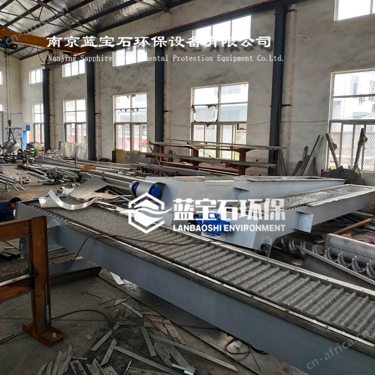 (3) 链条采用特制的宽链板不锈钢链条,链条的安全系数不小于6,并设有链轮张紧调节装置。在链槽中运转时,不需增加其他阻渣装置,即可有效防止栅渣缠入链槽,避免卡阻现象。