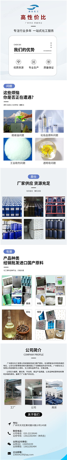 广州市辰仕化工主营产品: 桐油 卡松 柠檬酸 甘油、 硬脂酸、月桂酸、16-18醇、乙二醇、丙二醇、PEG系列、AES、AOS、6501、K12、AEO系列、NP系列、异丙醇 异丁醇 DMF