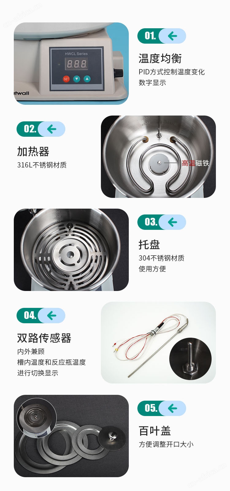 ●HWCL-3、HWCL-5内有双传感器,液槽内温度和反应容器内温度可转换显示。
