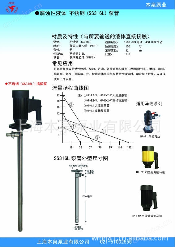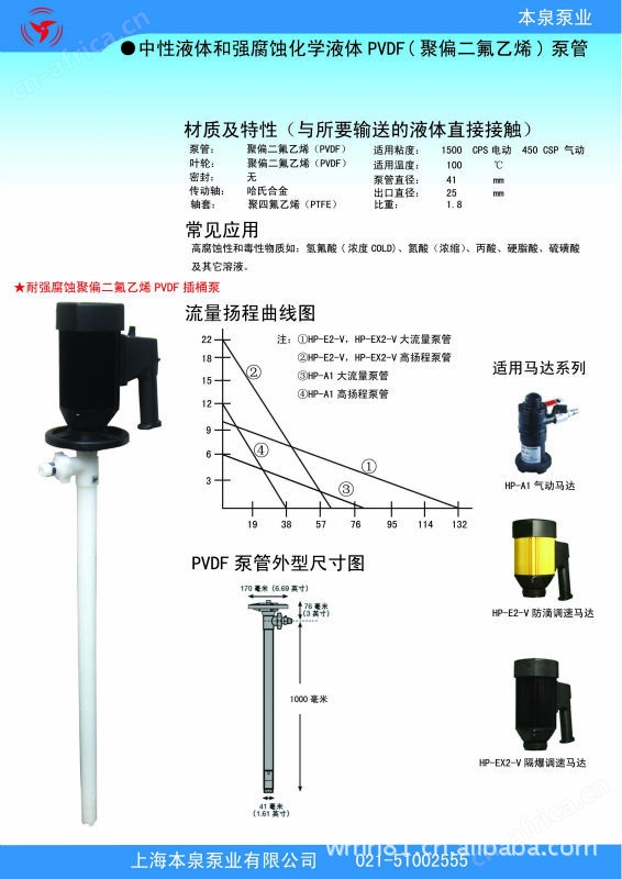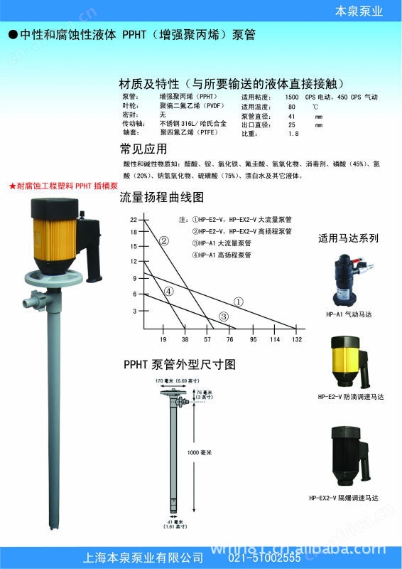氢氟酸插桶泵 上海本泉泵业有限公司是一家专业的高品质插桶泵制造商。成立之初,秉承“同步桶泵技术,制造品质桶泵"的产品宗旨,生产出了高品质的桶泵产品。所有桶泵产品均采用无密封泵管技术,无需考虑液体对密封圈的侵蚀;分段模块化的泵管设计技术,使泵的使用、拆装和维护变得十分简单,无需辅助工具即可实现对任何零部件的更换。调速马达的使用,使液体的输送流速变得可控,只需一款产品就可以替代传统型对不同功率产品的要求。所有电动马达,均采用内置安全开关技术,有效防置因过载和电流过大,而损坏电机;低压保护技术的采用,可有效预防泵在突然断电后再重启时发生意外。多种材质的泵管,聚丙烯(PP)、聚偏二氟乙烯(PVDF)、不锈钢304及不锈钢316L等材质的应用,让绝大部分低粘度到中等粘度,一般腐蚀到强腐蚀的液体的输送,变得轻松可靠,可以满足80%以上的场合的应用。泵管长度700mm,1000mm,1200mm,1500mm,1800mm,非标定制。低粘度泵适合输送稀薄的,中性的,腐蚀性的及高易燃性的液体。如醋酸、阿摩尼亚(氨),铬酸,甲酸,液体肥料,果酸,盐酸,氢氟酸,硝酸,磷酸,氢氧化钾,苏打水,硫酸;柴油,燃料油,液压油,低可燃性液体,皂液,液体蜡,水;丙酮,甲醇,合成树脂,油,汽油,溶剂,酸和碱;以及适用于食品化妆品及制药行业。氢氟酸插桶泵