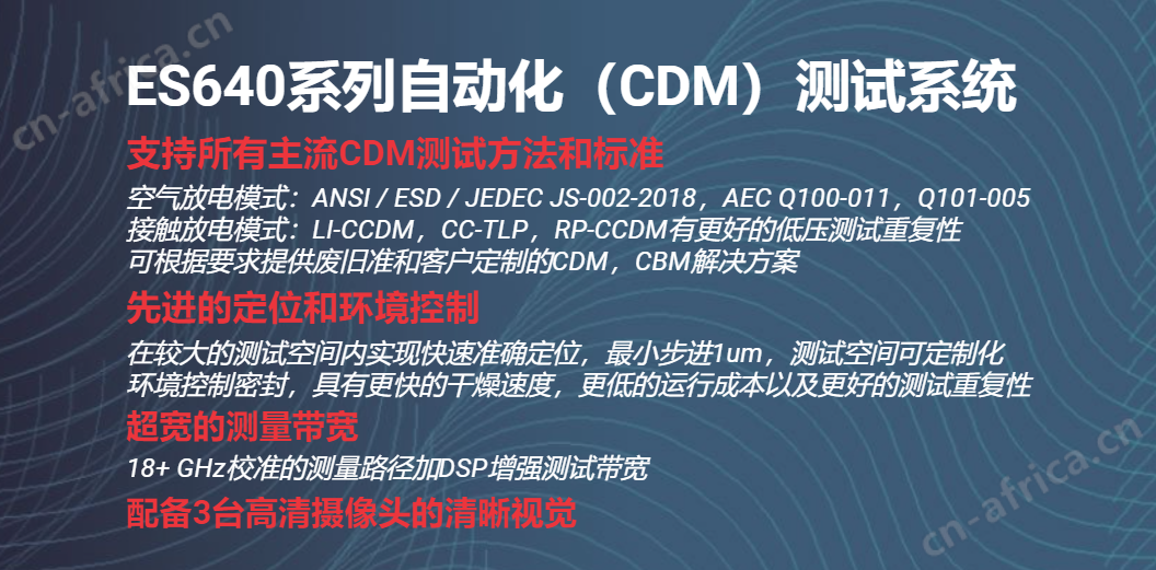 ES640是一款自动化的CDM测试仪,可满足所有流行的CDM测试方法,支持场感应空气放电方法(FICDM)和接触放电(LI-CCDM、CC-TLP、RP-CCDM)方法。本测试系统包含计算机、环境控制室、精确的XYZ运动控制系统、不同类型的CDM测试仪头以及自动测试和数据分析软件。
