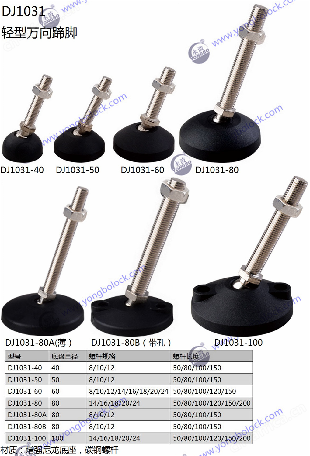 点击看大图 如果您对该产品感兴趣的话,可以 产品名称: 轻型万向蹄脚 产品型号: DJ1031 产品厂商: 永波 产品文档: 无相关文档