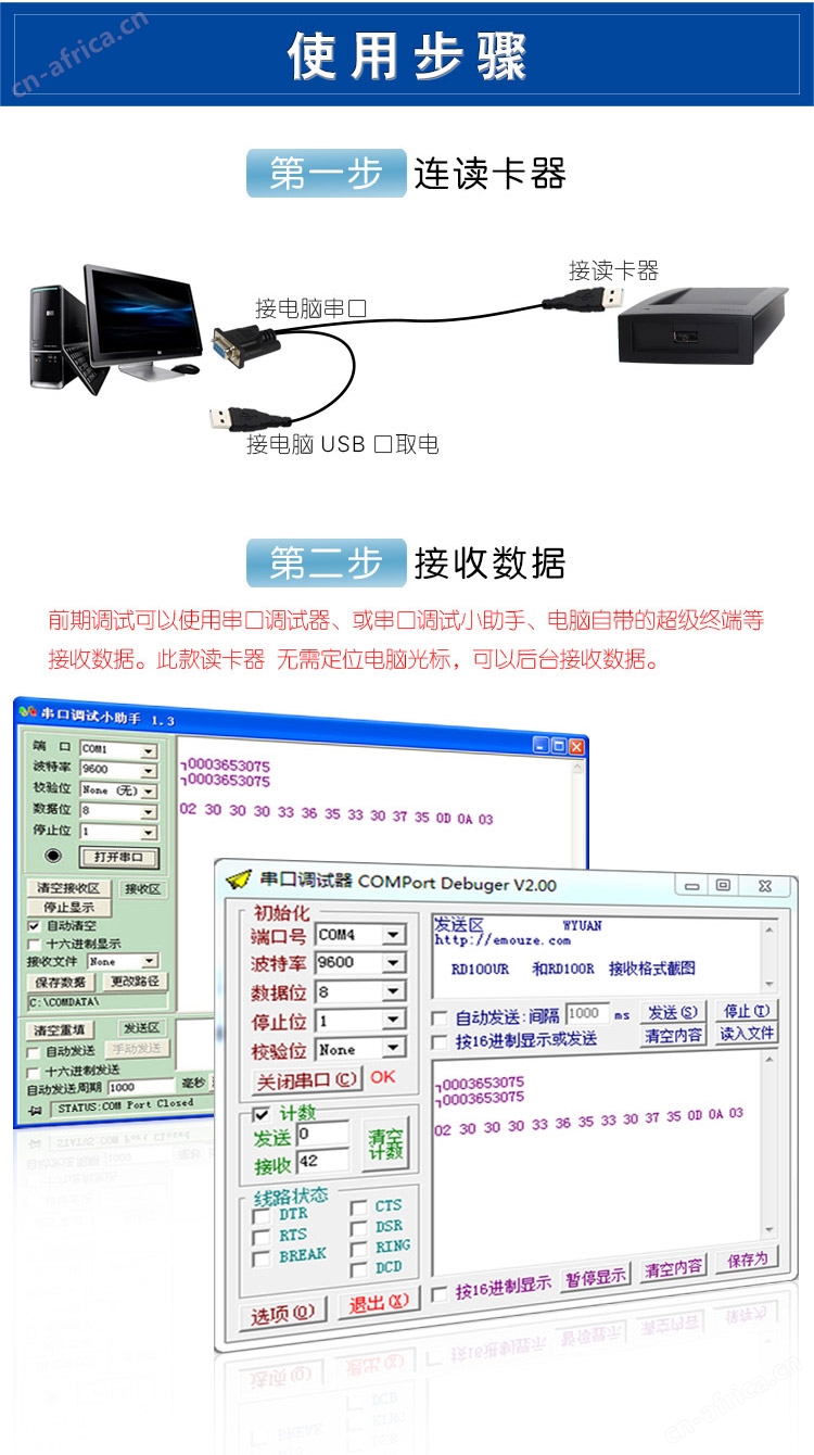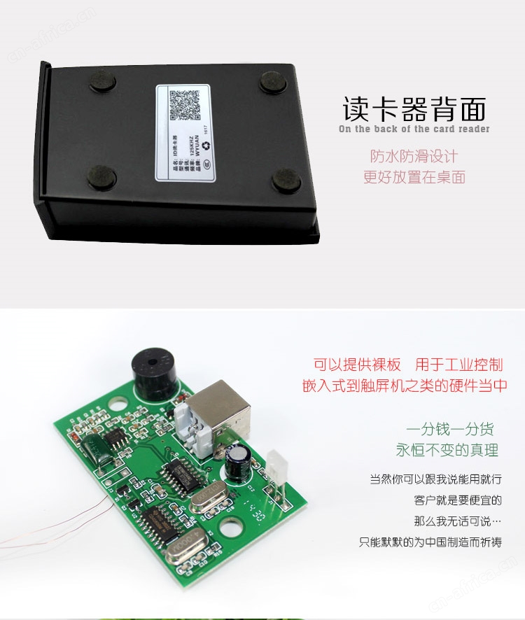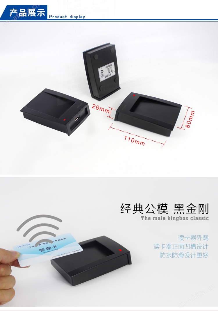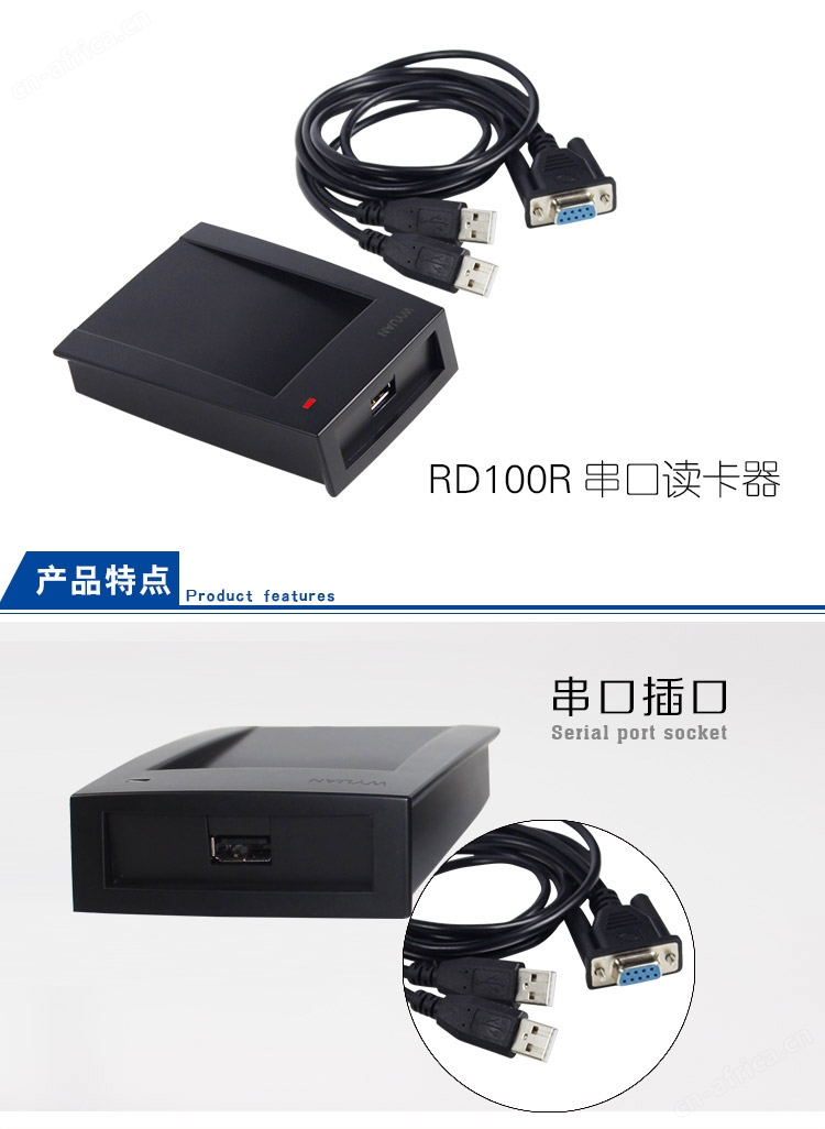串口读卡器-RD100R 本设备为采用微电子的射频接收模块及嵌入式微控制器,结合高效的解码算法和的数据处理技术, 对非接接触式卡进行读操作。 设备经过数年的升级和完善,已非常稳定, 主要应用会员管理系统,KTV vod系统,网吧管理系统,做为各种一卡通系统发卡及读卡设备, 【 性能参数】 ■ 读卡类型:ID卡 EM卡 可选IC卡 ■ 工作频率 125khz 可选13.56MHZ ,支持 ISO14443 TYPE A/B 标准 ■ 通讯格式:串口RS232 ■即插即用,无需驱动 ■ 供电方式: 5V 由usb提供稳定的电源,无需外接电源,并内置电源保护。 可延长至5米 ■一个LED指示灯和一个蜂鸣器,刷卡时蜂鸣器响一声,指示灯闪一下。 ■电源功率 0.2(W) ■读卡距离:0-15CM ■读卡时间:<100ms ■支持Windows/XP/WIN7/WIN10, 32位及64位系统均可支持。 ■采用流行的公模外观(尺寸:长×宽×高)10.8cm×7.8cm×2.8cm 重量约0.23KG ■输出数据为将卡内的低四个字节序列号转换为十位十进制数字,并回车结束,如果需要其他格式请我公司可以定制 ■接口在电脑9针串口 USB从电脑取电,属于电脑外部输入设备,可以后台接收数据 。 ■可以提供裸板 对接单片机 或PLC之类的工控设备