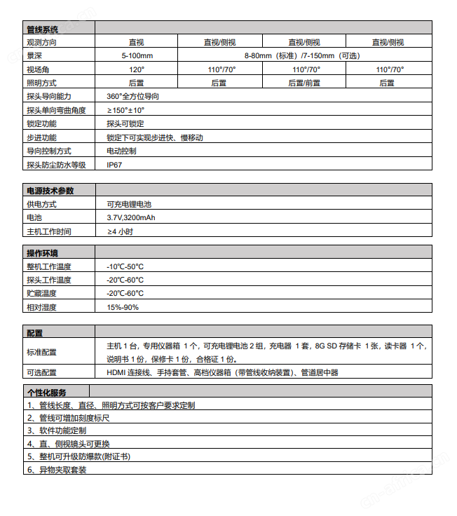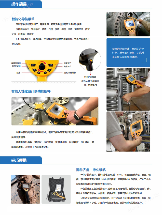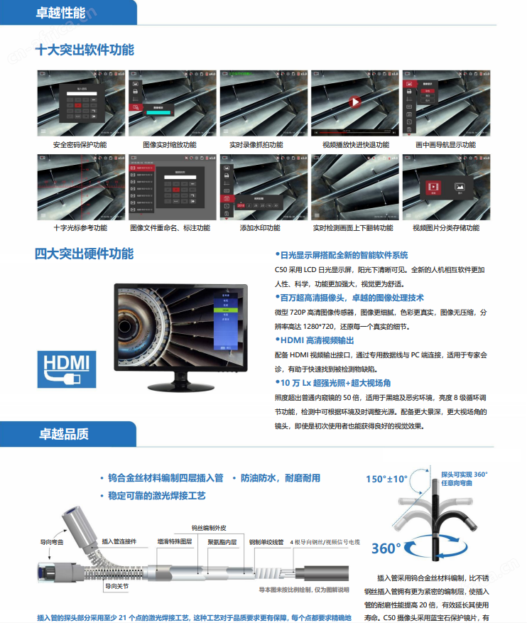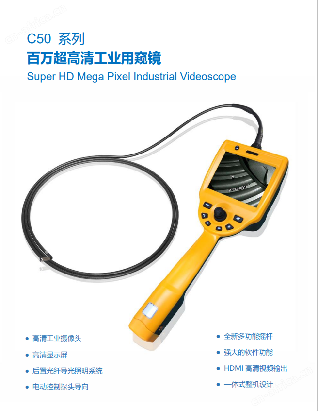 C50系列是一款任意导向型电动工业视频内窥镜,本产品采用一体式整机手持式设计,轻巧便携,操作简便,可拍摄照片和录制视频。**的图像传感技术,可显示更高清晰度的图像,**呈现缺陷细节。该产品已广泛应用于航空航天、能源电力、石油化工、汽车制造、机械铸造、特检行业、食品药机等诸多领域。