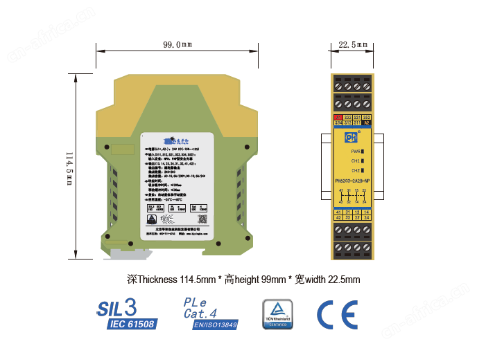 PH6203-2A2B-NP是一款安全继电器控制模块,适用于NPN、PNP型安全光幕输入,具有2路常开(NO)安全输出触点和2路常闭(NC)辅助输出触点的安全继电器。它支持双通道操作,可选择手动或自动复位。