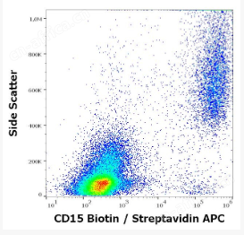 Flow cytometry surface staining pattern of human peripheral whole blood stained using anti-human CD15 (MEM-158) Biotin Monoclonal antibody (Product # MA1-19490) (concentration in sample 2 µg/mL, Streptavidin APC)