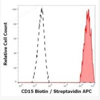 Separation of human neutrophil granulocytes (red-filled) from CD15 negative lymphocytes (black-dashed) in flow cytometry analysis (surface staining) of human peripheral whole blood using anti-human CD15 (MEM-158) Biotin Monoclonal antibody (Product # MA1-19490) (concentration in sample 2 µg/mL, Streptavidin APC)
