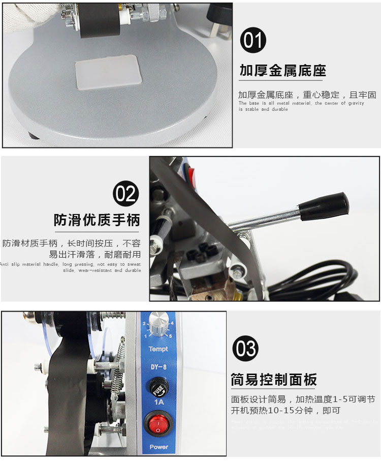 手动移印机是一种*的接触式热打码机。本机采用间歇式自动加热和精密的机械相结合,可根据用户需要,任意选择打码内容与打码位置,并可设定打码的张数打码速度快,性能可靠,字迹清晰,打码动作及计数采用光电开关控制。手动移印机结构新颖,不锈钢外壳,光电控制,自动计数,并可预置押印张数及部位。采用*的固体墨轮印字,字迹清晰,瞬印瞬干,不易擦除。