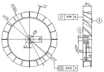 涡轮流量计的结构紧凑,其中叶轮是流量计的关键件,是传感器的检测元件。叶轮由高导磁性材料硬铝2A12制成,与表体同轴,叶片数常用12~24片,叶轮几何形状及尺寸对传感器性能有较大影响,叶片的旋转角度与导程的精确程度,直接关系到涡轮流量计的精度,即检测线性度的值。型号为150的叶轮的结构尺寸如图1。