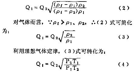 如果两种不同密度ρ1、ρ2的介质分别通过同台转子流量计时,若浮子平衡在同一位固上,由(1)式得转子流量计密度换算的基本式: