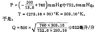 例:使用某空气采样仪,运行时,采样仪上转子流量计读数为500毫升/分,测表前压为—100mmH 20(因使用抽气泵,所以是负压),现场温度为30℃,求此时空气的实际流量值。