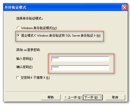 4, 安装时在“身份验证模式”选择“混合模式”,为了安全并设置数据库密码。如下图