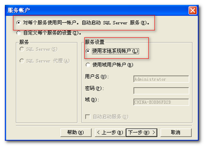 3, 安装时推荐设置“服务帐户”>“使用本地系统帐户”如下图
