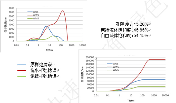样品的微分谱中可以看出来,饱锰样中加入锰使水的弛豫时间变短,采集不到水的信号,只能采集到油的信号。从饱水样的弛豫谱中可以得到孔隙度,束缚流体饱和度、自由流体饱和度,结合原始样和饱锰样弛豫谱可以得到含油饱和度和含水饱和度。
