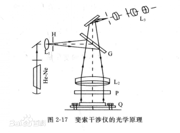 图2—1 7是斐索干涉仪的光路。单色光源如氦氖激光器照明小孔H,形成一点光源。点光源射出的光束经分光镜G反射后,射向透镜L2,变成平行光束,然后垂直射向标准平晶P。一部分光被P上表面反射,另一部分光透过P射向被测件Q。被Q上表面反射的光束和被P上表面反射的光束进人观测系统后,会产生等厚干涉条纹,用以测量Q上表面的面形误差。若将标准平晶P改为球面样板,即下表面为球面,则可测球面的面形误差。把标准件P拿掉,使被测件Q的上、下表面反射的光束干涉,则可测Q的平行度。