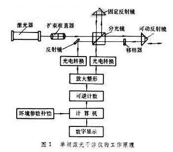 图1为单频激光干涉仪的工作原理。从激光器发出的光束,经扩束准直后由分光镜分为两路,并分别从固定反射镜和可动反射镜反射回来会合在分光镜上而产生干涉条纹。当可动反射镜移动时,干涉条纹的光强变化由接受器中的光电转换元件和电子线路等转换为电脉冲信号,经整形、放大后输入可逆计数器计算出总脉冲数,再由电子计算机按以下计算式计算