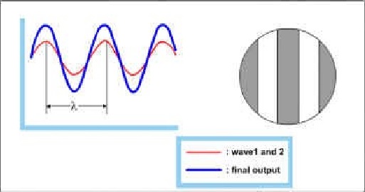 2. 建设性干涉如下图所示,假设蓝色波与红色波的值在同一位置时,其相加数值就是2,当蓝色波与红色波重迭在一起时, 迭加起来就会变成较高的黑线, 当我们肉眼看到时, 黑线的点就会变亮, 点则较暗, 而会有明暗的线条变化, 我们就称做建设性干涉 当蓝色波与红色波的相加数值为0~2以内时, 波长会较为平缓, 就会产生灰阶的渐层条纹变化了.