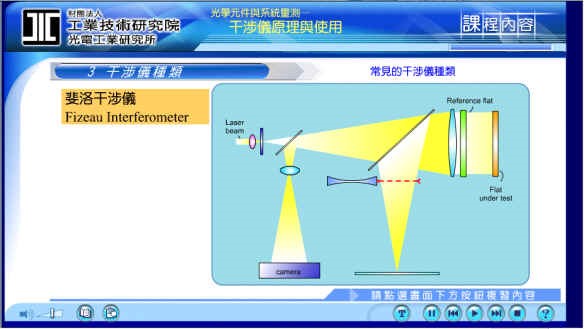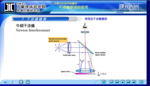点光源经过透镜变成平行光后, 打到下方椭圆形待测物上, 这个待测物可能为透镜之类的物体, 待测物下方的平面Optical flat 则是参考面, 通常做为参考面的平整度, 也就是Surface irregularity, 必须要1/10λ以上, 分母愈大就表示其平整度愈好.