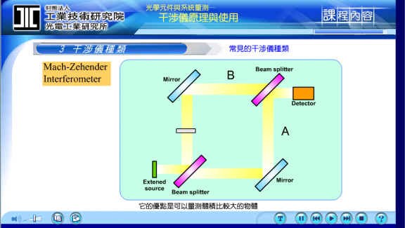 左下方的光源Extended source, 为一与迈克尔逊干涉仪相似的扩展光源, 光源经过个 Beam-splitter之后分为二道, 各别经过一片Mirror反射镜, 再经过第二个Beam-splitter合成一道光之后, 将结果打到Detector上.因为中间分为二道光源的关系, 在空间及距离上可以做较大的调整, 所以比较适合测量体积大或穿透性大的物体, 例如: 我们可以用来测量大面积的玻璃.将待测物放在路径上的个 Beam-splitter与Mirror反射镜之间, 我们就可以看到路径A、路径B与待测物之间的差异.这也是一个非共路径干涉仪, 它的缺点是: 容易受空气变化等的外力影响,优点是: 可以测量体积或面积较大的物体.