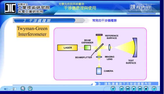 Twyman-Green 干涉仪和迈克尔逊干涉仪很相似.当一道光源进来, 经过BEAM EXPANDER将光源变得比较大束后, 经由中间的BEAMSPLITTER 分为二道光, 反射回来之后再回到侦测器,上每种干涉仪都有各自不同的应用范围、方向和限制.