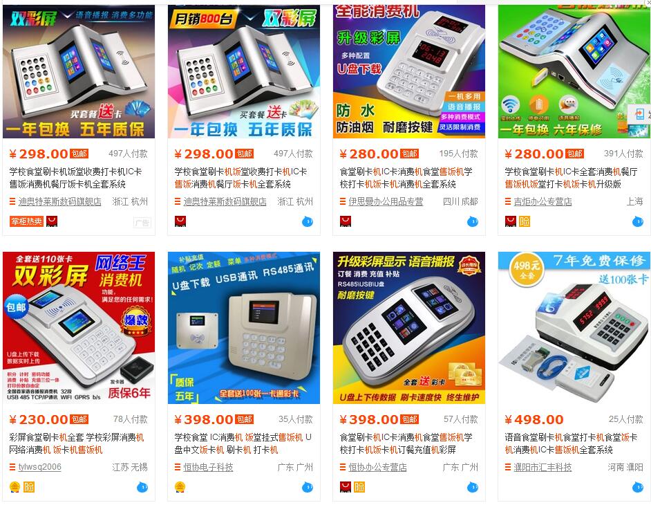 淘宝上售饭机一搜一大把,但是仔细观察一下,你可以发现这一类售饭机都没有品牌!而且外观大同小异!尽管功能看起来非常强大,而且价格非常便宜,似乎是理想选择,但是,消费机不是一锤子买卖,这个还需涉及到售后以及技术支持,关于这方面需要慎重考虑。