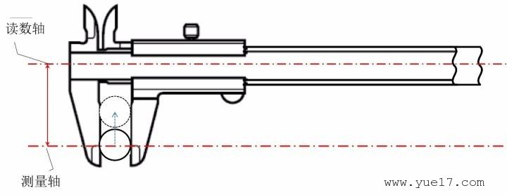 如图所示,卡尺的读数轴和测量工件的测量轴并不是同轴。两轴间的距离越大,潜在误差也就越大。由此使用卡尺进行测量时,被测工件需要尽可能的接近尺身部分(读数轴)。