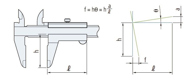 基准端面的弯曲 引导游标尺滑动的尺面如果有弯曲,会导致如下图所示的误差,这一误差可以用与不符合阿贝原理的误差相同的计算公式来表示。