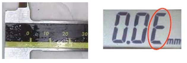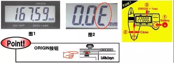 卡尺更换电池后,显示屏可能会出现任意数值(如图1),如不进行原点设置而直接使用的话,会出现图2中末位“E”的报错现象。