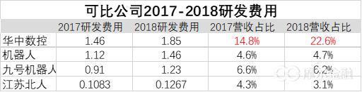 作为对比,创业板上市多年的机器人营收超过30亿,但是研发投入值均不及华中数控,2017-2018年营收占比亦只有4.6%和4.7%,即将挂牌科创板的江苏北人和九号机器人2018年营收占比分别只有3.1%和6.2%,跟华中数控20%的研发投入不在一个量级。