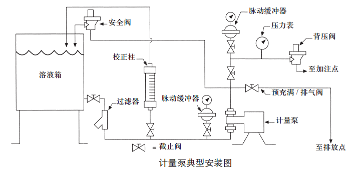 因为计量泵属于加药泵,很多介质都具有一定的腐蚀性。因此,计量泵的安全地运行尤为重要,因此我们需要对计量泵的安装进行合理的布置和规划,添加必要的阀门是很有必要的。