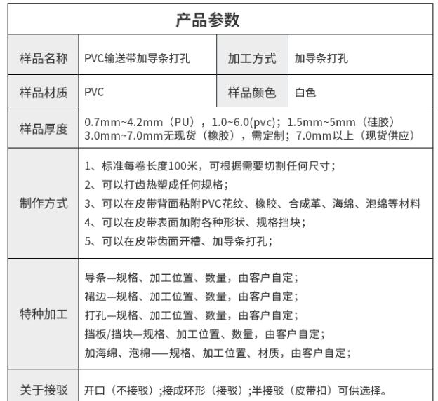 擎川专注轻型工业输送皮带领域,16年来,服务过超3000家企业,其中不乏品牌,而擎川更擅长PVC轻型工业输送皮带的定制,今天我们就来给大家介绍三款白色的样品:白色PVC输送带,白色PVC输送带加导条,加导条打孔白色食品PVC输送带。