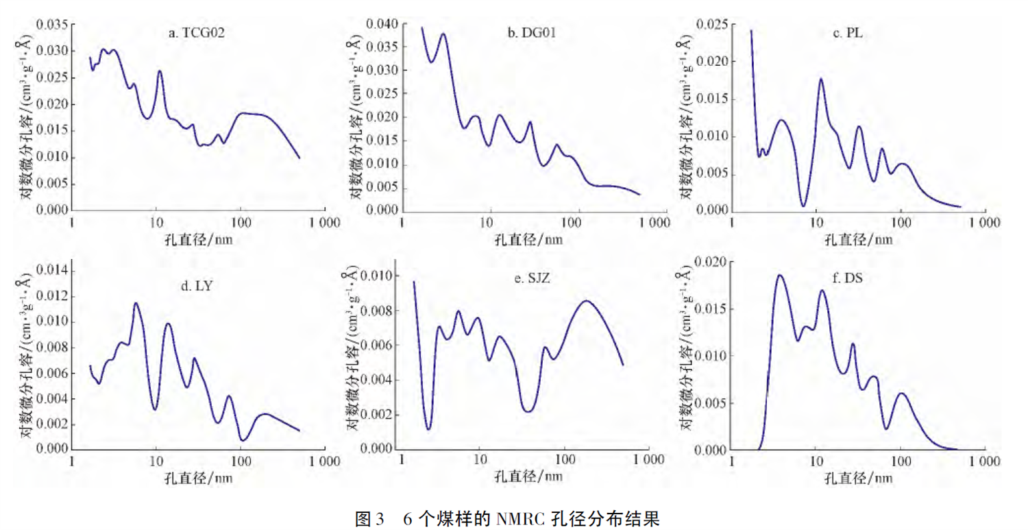 被测煤样的孔隙发育情况与其煤化程度密切相关,说明煤化作用引起的煤变质程度的不同对孔隙发育影响显著。且随着变质程度的增高,NMRC 总孔体积呈现“先降低后升高”的趋势,这与煤岩孔隙度随煤岩变质程度的增高表现出的“先降低后升高”的变化趋势相一致。 下图为煤样NMRC孔径分布结果: