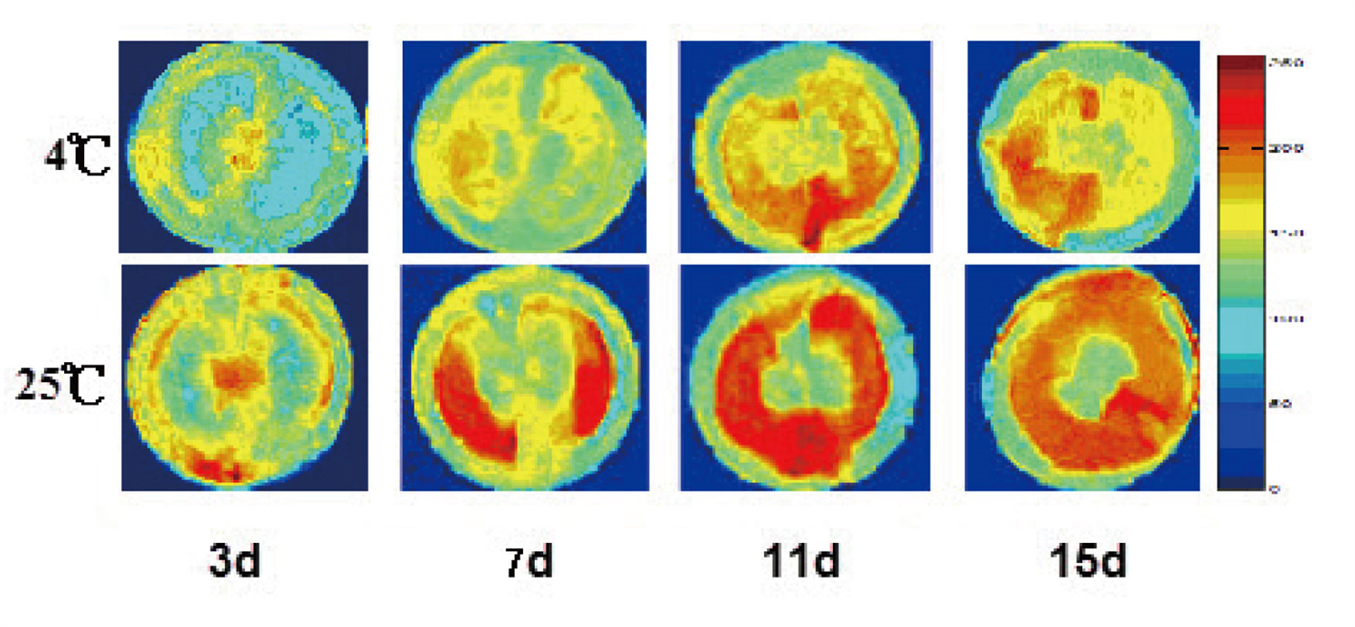 核磁共振在食品领域部分案例分享(相关仪器) | | 案例一:不同超声波辅助压力处理下鸡肉的水分相态及运动性的变化 | |  | | 图1 不同超声波辅助压力处理对鸡肉T2图谱影响 注:J0-J5为不同超声波辅助压力处理;T21为结合水,T22为不易流动水,T23为自由水; | | 不同超声波压力辅助处理后,自由水向不易流动水转化,鸡肉的持水力增强。 | | 案例二:不同种胶体及不同浓度胶体T2弛豫时间图谱 | |  | | 图2 不同种及不同浓度胶体T2弛豫时间图谱 | | 案例三:不同温度下圣女果储藏过程的品质变化 | |  | | 图3. 不同储藏温度对圣女果储藏过程氢质子密度加权成像的影响 | | 圣女果在25℃储藏腐烂速度明显比4℃的快,25℃条件从第3天开始就出现腐烂,而4℃条件下到第11天内部才开始出现明显腐烂,且25℃条件下圣女果的腐烂程度更 | | 使用仪器: 核磁共振成像分析仪NMI20-025V-I | | |