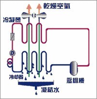 经过降温冷凝后的空气是处于高相对施度的状态,必须将空气流经冷冻循环中负责排热的冷凝器,使其加热后排出。再加热之后的空气便成为低湿度的干燥空气。