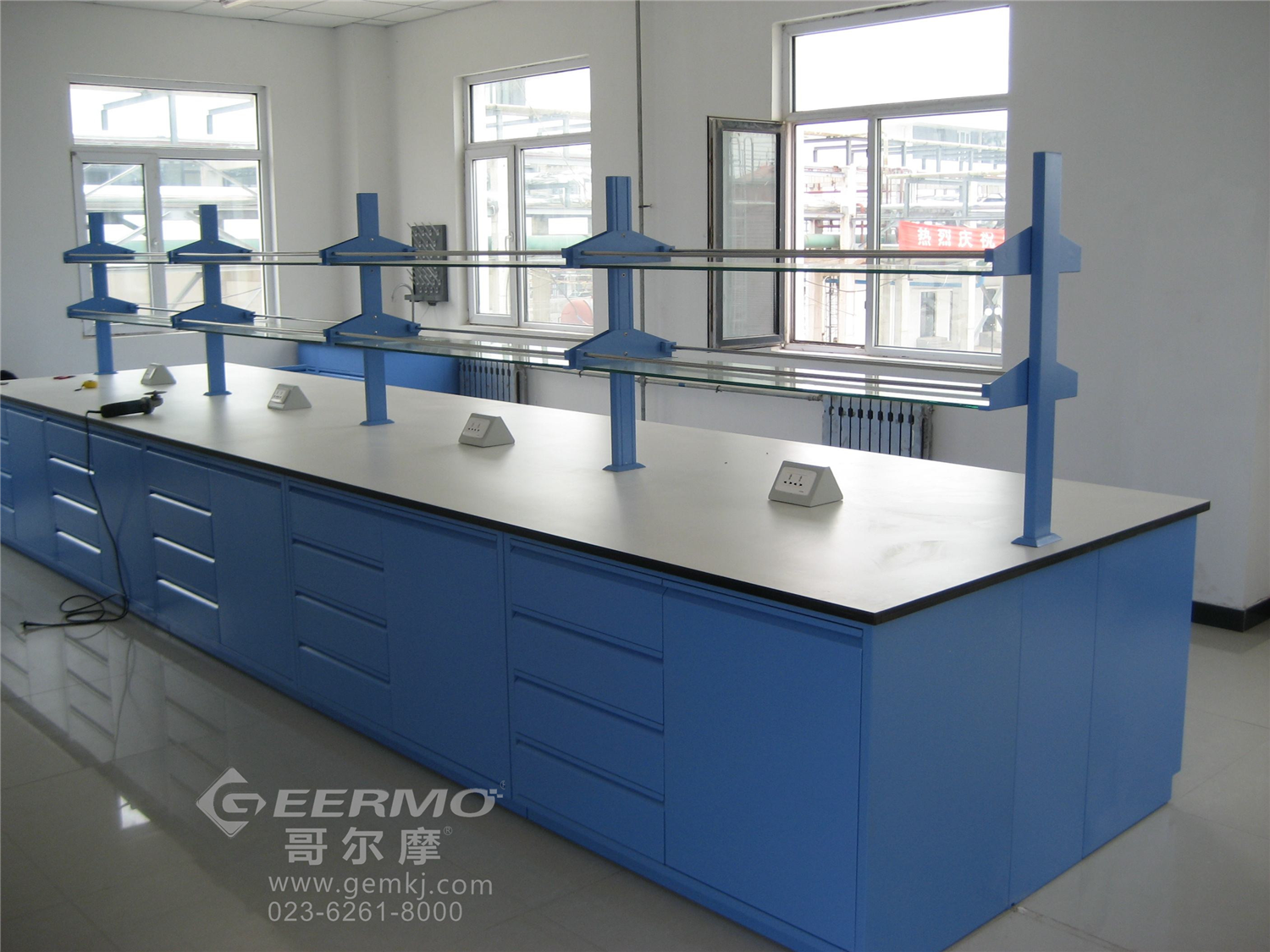 实验台:进行物化实验所需要使用的平台。根据在实验室中的位置布局,实验台又分为实验台和实验边台。一般来说从结构上来说,实验台由框架、台面、柜体、试剂架、化验水槽等组成。