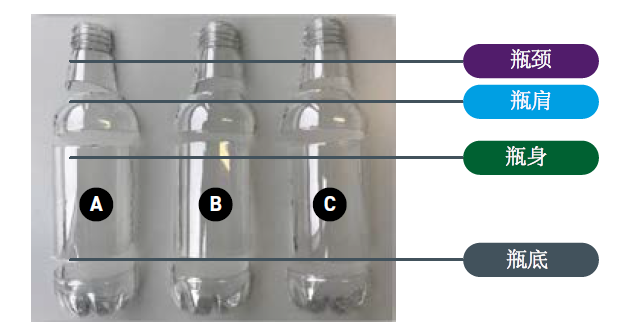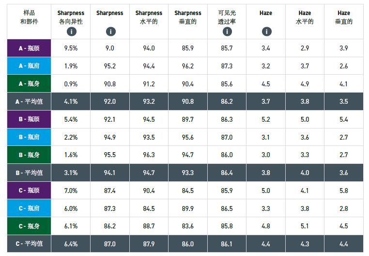 步骤1: 测试了三个不同的客户提供的PET瓶样品。 在视觉上,它们均被认为是低雾度且具有“水白色”外观。 将每个瓶子(A,B和C)切成4个部分,标记为: 瓶颈 | 瓶肩 | 瓶身 | 瓶底 在Rhopoint ID-L上进行测量。仔细检查后,瓶子C的部件在视觉上呈颗粒状,清晰度通常较低,并且在材料中包含可见线,表明存在各向异性。