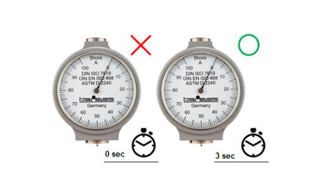 如使用的是一款表盘式邵氏硬度计,在探针压入样品后,需默数3秒,其3秒后的值为标准规范里的硬度值也是稳定的硬度值。