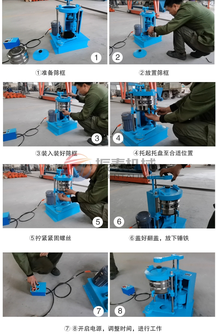 4、安装试验筛:松开托盘紧固螺丝,将托盘向下移动,装入装好物料的标准试验筛(分样筛、标准筛),然后托起托盘至合适位置,拧紧紧固螺丝,盖好翻盖,放下锤铁后,定好时间即可开机。采用100、75夹具可使用相应尺寸套筛,特殊尺寸可定制。
