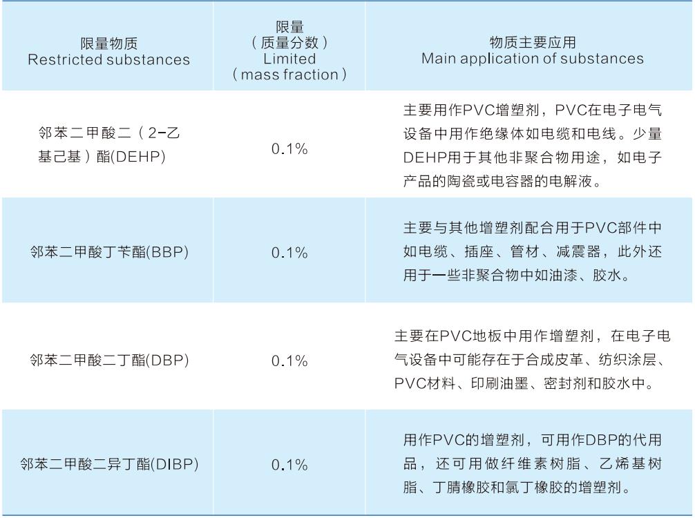 2015 年 6 月4日, 欧盟公报(OJ )发布RoHS2 . 0 修订指令(EU )2 015 / 863 . 正式将 DEHP 、DBP 、BBP 、DIBP列入附录Ⅱ限制物质清单中,至此附录Ⅱ共有十项强制管控物质。此修订指令发布后,欧盟各成员国需在2016年12月31日批准和发布遵从该指令的法律、法规和行政规定,相关规定 应从2019年7月22日起实施。