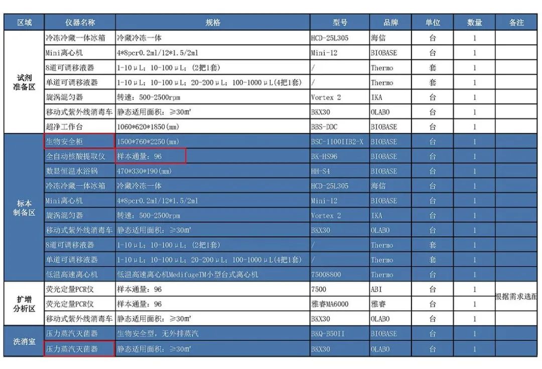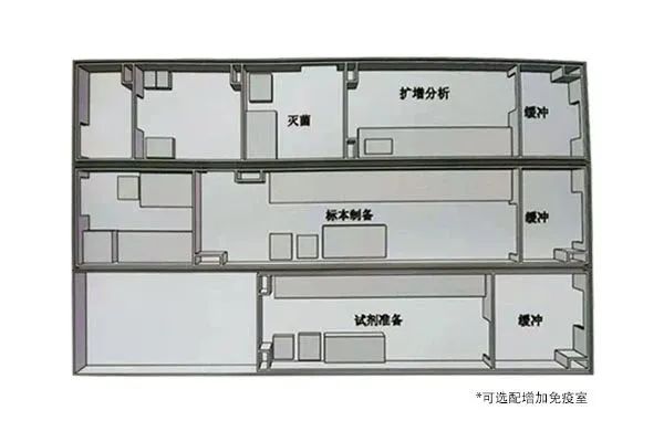 001试剂准备区:贮存试剂的制备、试剂的分装和扩增反应混合液的准备,以及离心管、吸头等消耗品的贮存和准备。