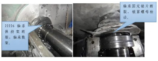 2.3.1 造成此次事件发生的直接原因是叶轮侧支力轴承(SKF 22226)保持架断裂、轴承散架造成的。滚动轴承保持架的作用是分离滚动体、将滚动体本身保持住或使其与一个套圈保持在一起、引导滚动体在正确的轨道上滚动、对滚动体定向减少摩擦力。如果保持架损坏,那么轴承就不能正常的运转,导致轴承振动和温度上升。造成轴承保持架损坏的原因主要有以下几点: