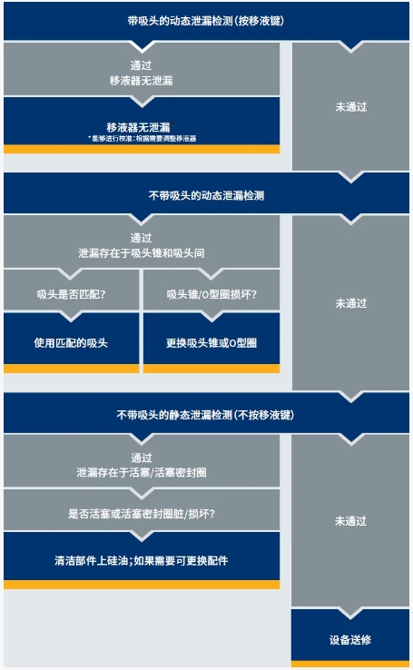 静态测试时无需按压移液键,即活塞不移动,这仅能用于确定整个移液器系统是否存在泄露,无法判断是否活塞组件的问题导致泄露。