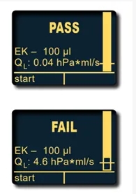 PLT会依据国际标准ISO 8655-2对检测情况进行判定,在屏幕中显示结果,右侧的条形图表示QL的临界值与泄露情况。