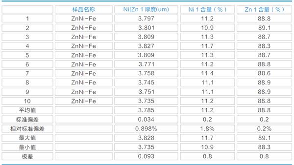 实例1:紧固件铁镀锌镍比例和厚度测试值