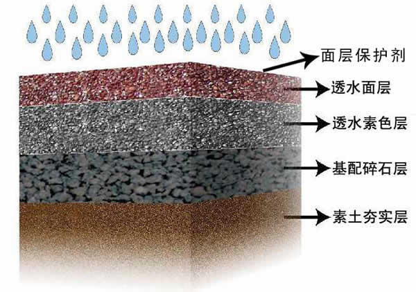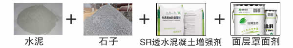 透水混凝土材料组成:水+水泥+石子+SR透水混凝土增强剂+面层罩面漆(保护剂)