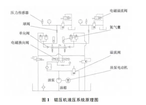 溢流阀的调整压力决定油泵往系统的供油压力,液压油通过电磁换向阀、单向阀,经过两阀配合对动辊左右侧液压缸进行加压,通过压力传感器测定系统压力,当达到设定压力时停止加压。正常工作时电磁溢流阀关闭,通过氮气囊的缓冲来使动辊进退自如进行挤压物料。当动辊回退压力过大达到电磁溢流阀的设定压力时,系统液压溢流并随机关闭;系统压力小时液压油站油泵自动启动进行补油,以达到设定的系统压力,保证整个液压系统压力达到设定压力。